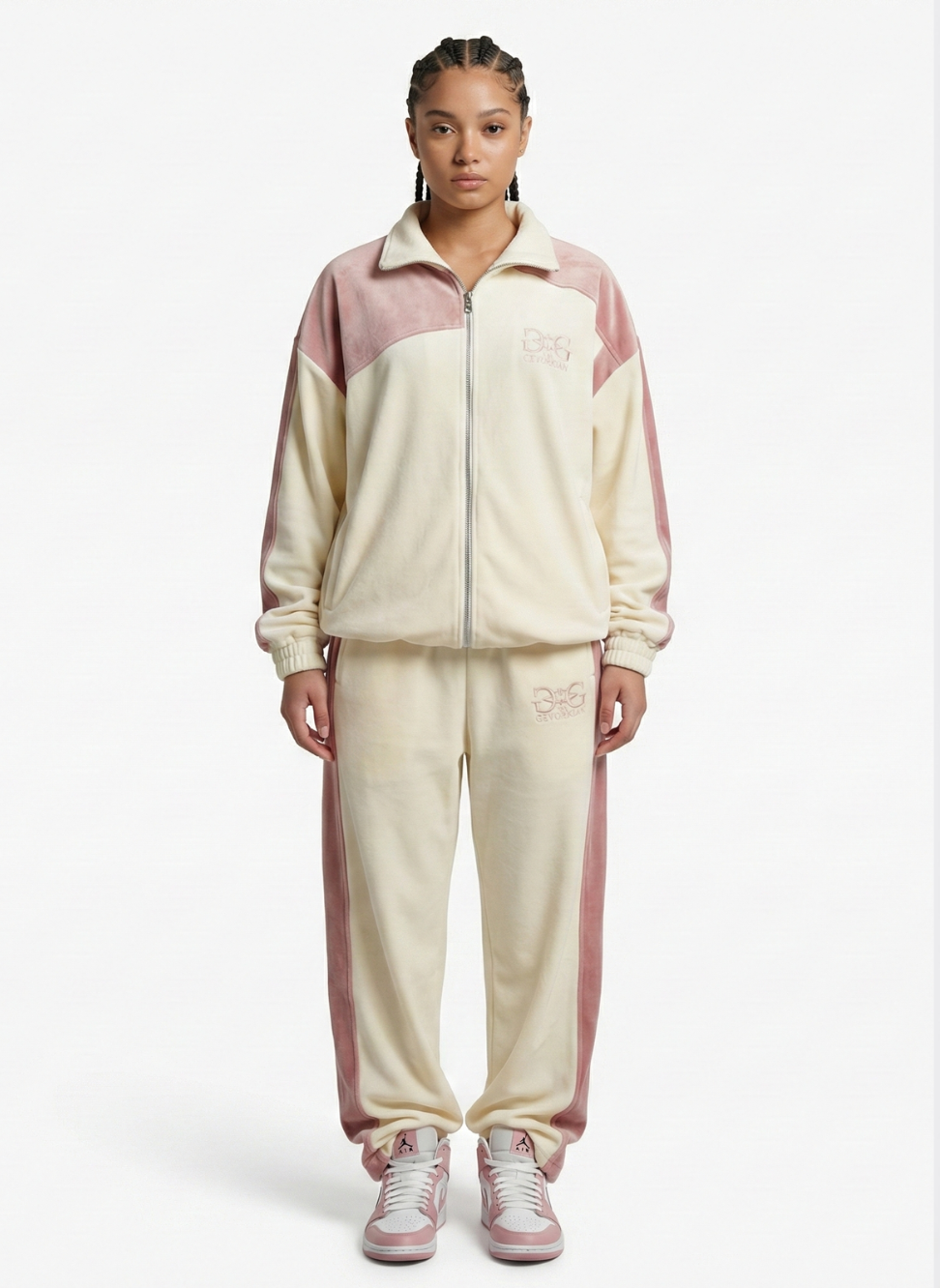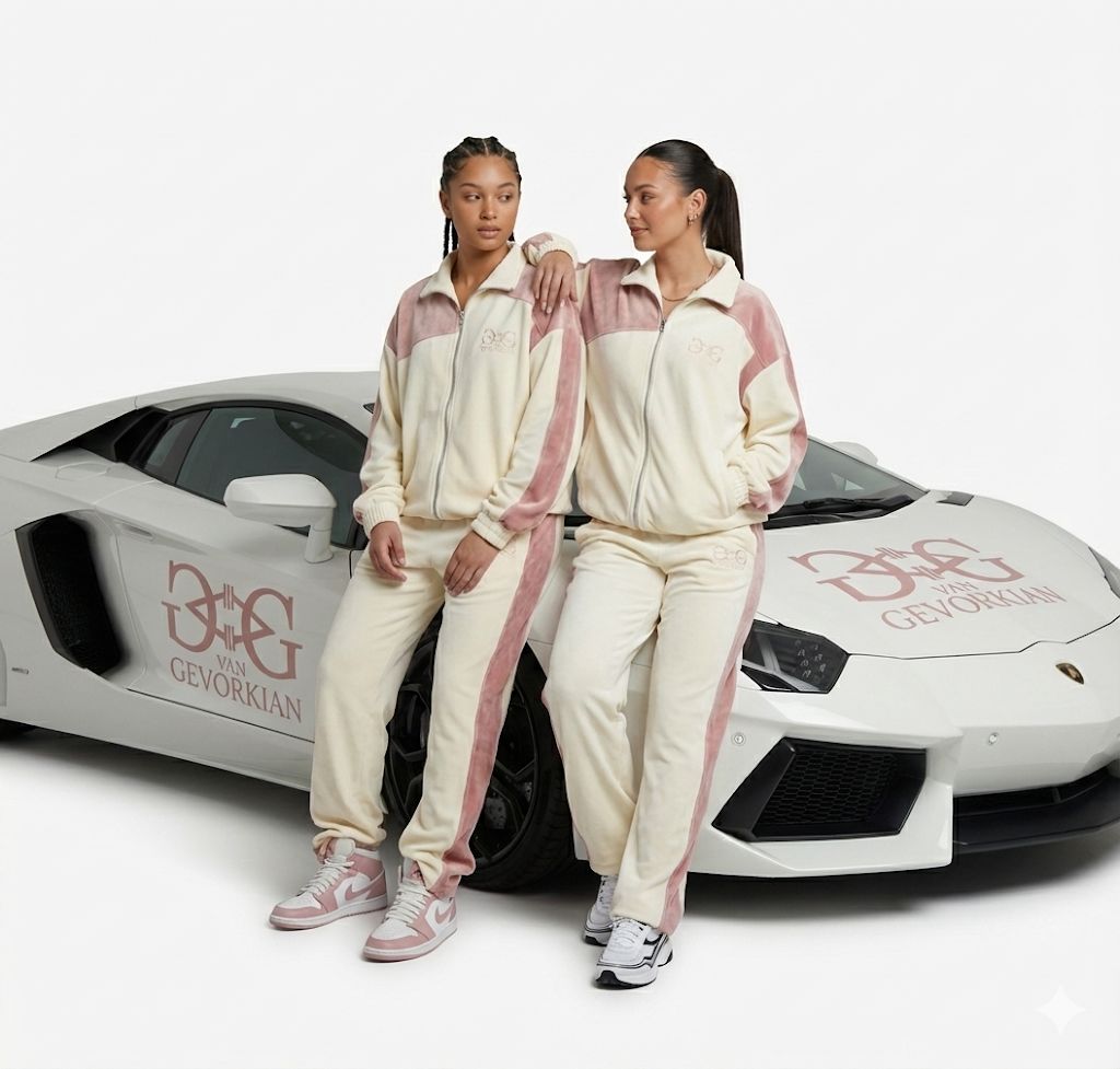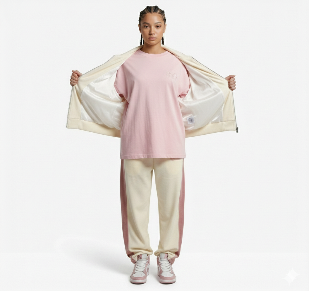 Experience the ultimate in fluid luxury. The VG "Cloudy" tracksuit by VG Van Gevorkian blends a crisp Milk White base with soft Dusty Rose accents. This premium set is crafted from high-density cotton-polyester velour, offering a cloud-like softness with the durability of high-end streetwear.